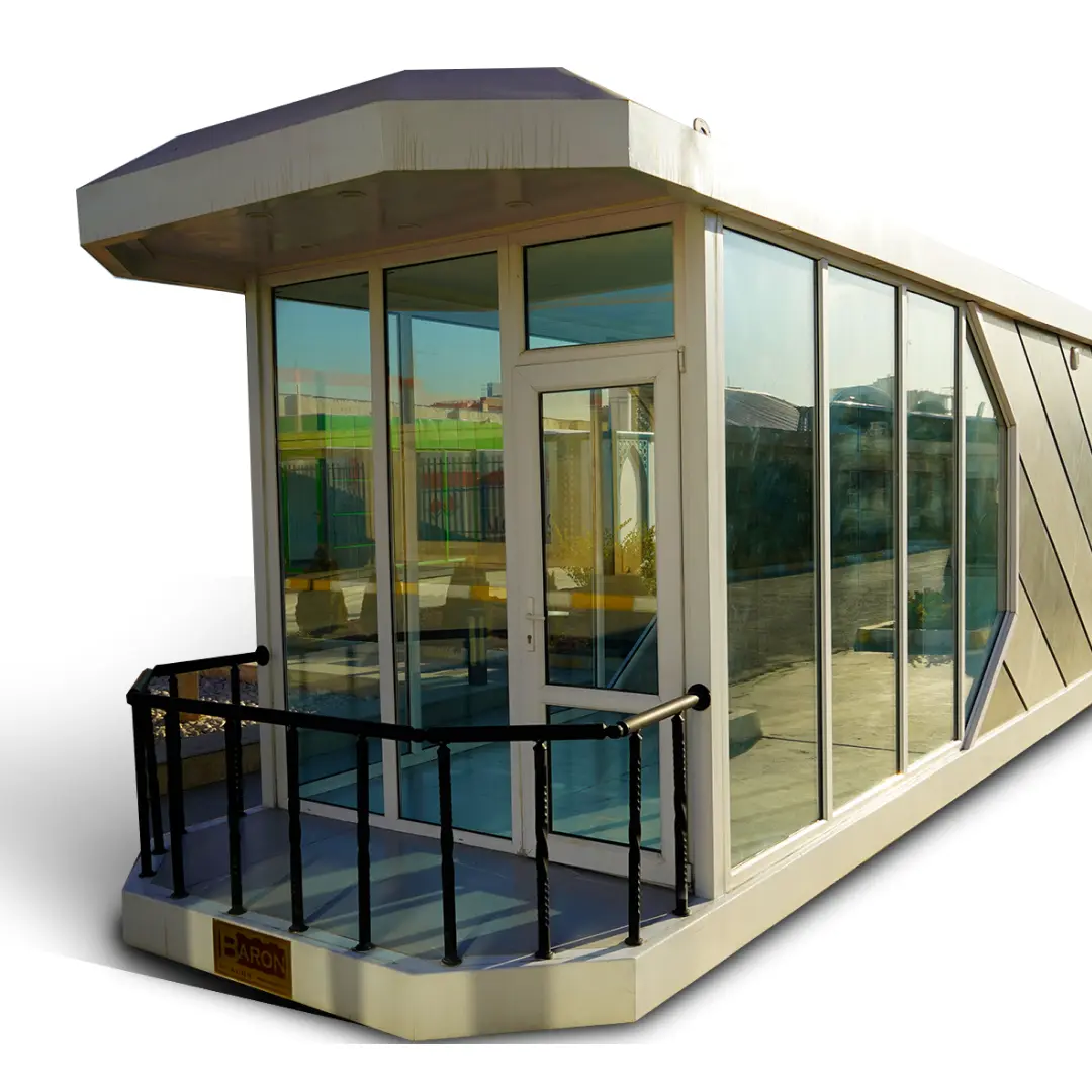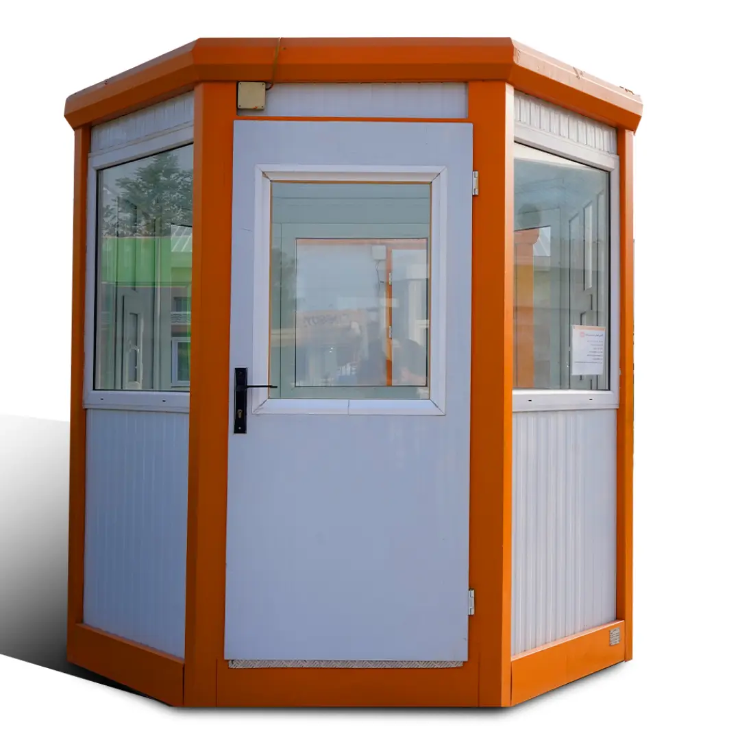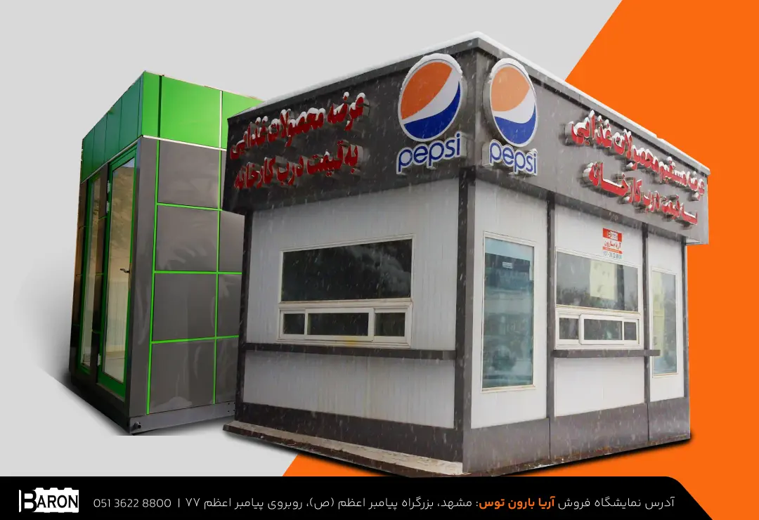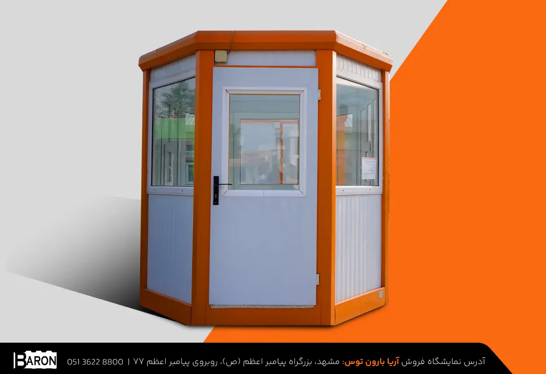 کانکس نگهبانی آریا بارون با اسکلت گالوانیزه، عایقبندی کامل و پنجرههای سرتاسری، دید وسیع و امنیت پایدار را برای ورودی مجموعهها فراهم میکند.
