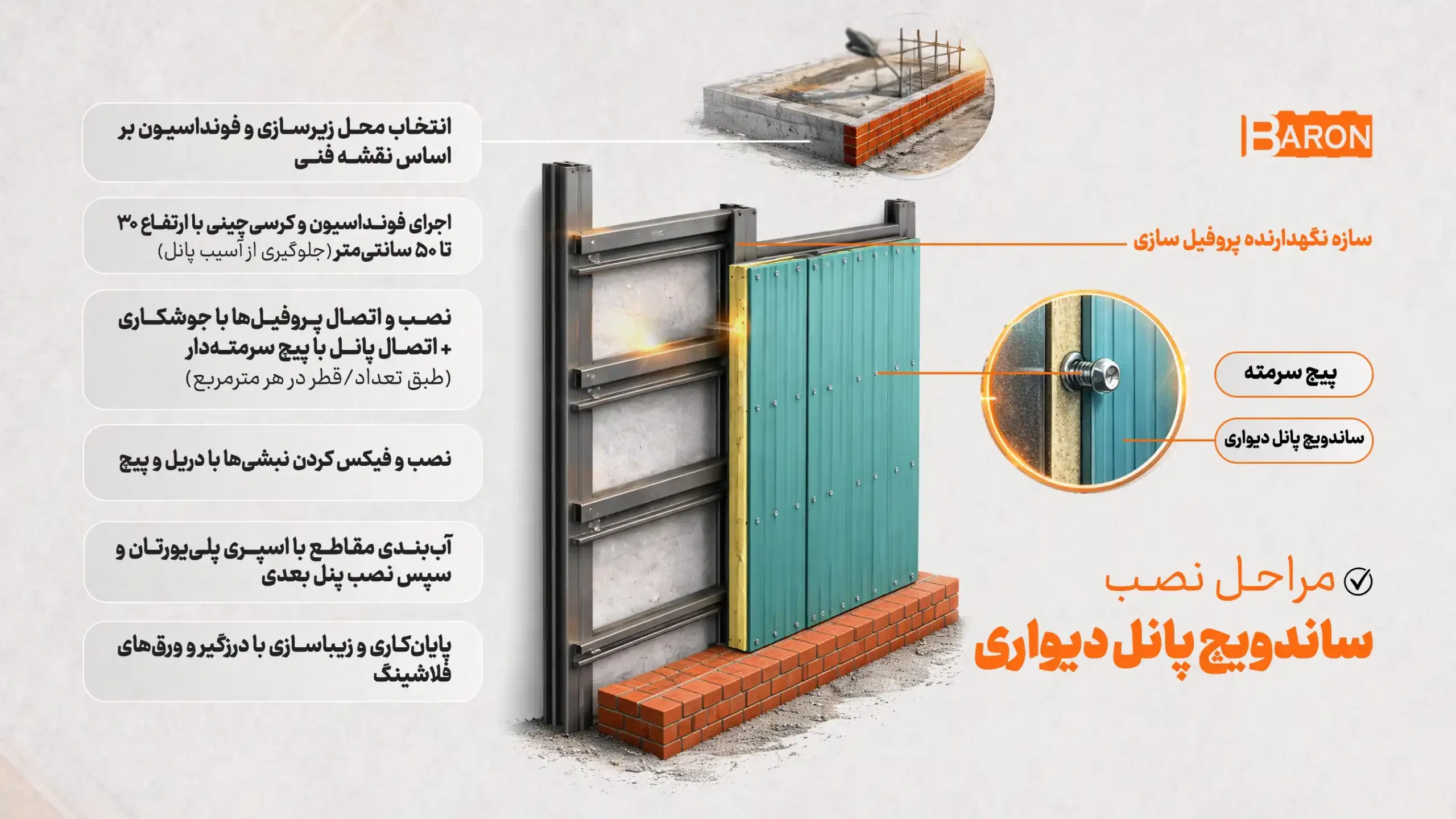 نصب ساندویچ پانلها نیازمند رعایت دقیق مراحل زیرسازی، نصب سازه فلزی و توجه به جزئیات اجرایی است. با انتخاب صحیح پروفیلها و اجرای دقیق مراحل، میتوان به یک سازه پایدار و مقاوم دست یافت. آریا بارون با ارائه مشاوره تخصصی و محصولات با کیفیت، آماده است تا شما را در این مسیر همراهی کند. برای کسب اطلاعات بیشتر درباره محصولات و خدمات ما، لطفاً با ما تماس بگیرید.