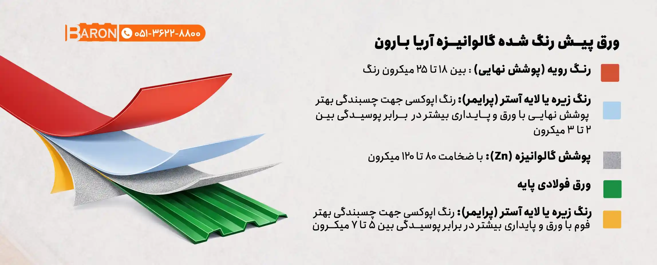 آریا بارون برای اطمینان از کیفیت مطلوب و استاندارد ورق ورودی به خط تولید خود اولاً مستقیماً از شرکت های معتبری همچون کارخانه فولاد مبارکه ورق تهیه مینماید و علاوه بر آن تمامی آزمایشهای استاندارد کنترل کیفی مانند تست سالت اسپری، ضخامت سنجی رنگ، مقاومت رنگ در برابر خمش و در برابر ضربه را قبل از ورود به خط تولید در آزمایشگاه کنترل کیفیت مواد اولیه واقع در کارخانه روی هر محموله انجام میدهد .